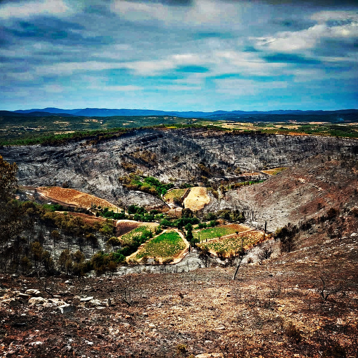De ce brasier diabolique, les vignes, protectrices héroïques mais décimées, ont en partie sauvé le moulin, et une poignée d’arbres. Les oliviers sont carbonisés, le chant incessant des oiseaux, le crissement des cigales ont laissé place à un silence de mort. Et à son odeur.